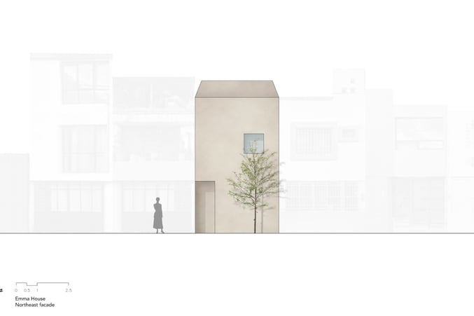 An important detail is the small window at the front of the home, strategically placed to capture views of the newly planted foliage outside. This feature creates a striking visual effect on the façade, with shadows shifting throughout the day and casting intricate patterns on the plaster walls. The interplay of light and shadow enhances the home’s serene aesthetic and reflects HW Studio’s meticulous attention to detail.
